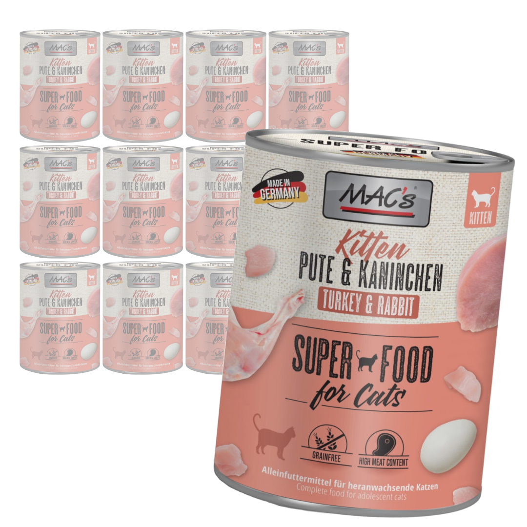 MAC's Kitten to wyjątkowo smaczna mieszanka indyka i królika, opracowana jako zbilansowana, pozbawiona zbóż, pełnoporcjowa karma dla kociąt.