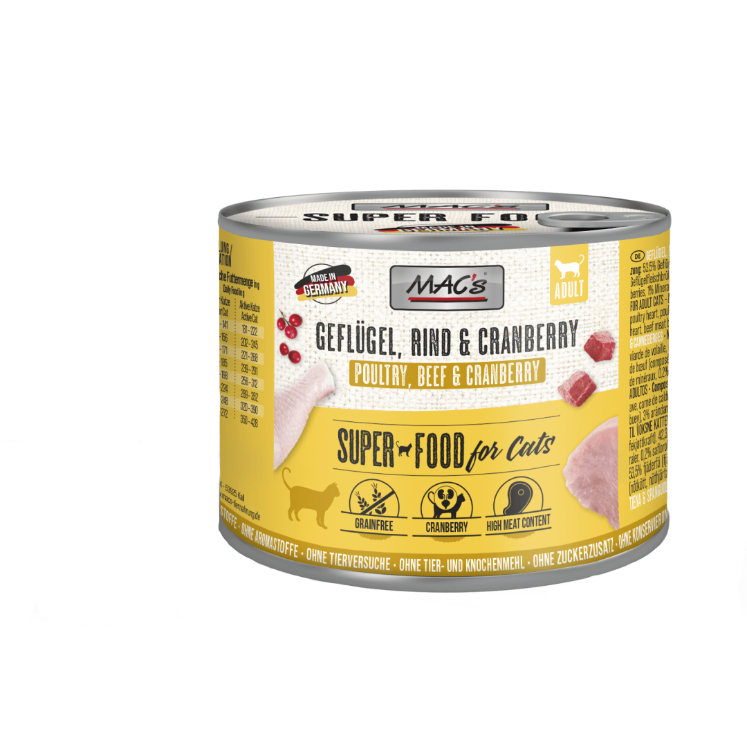 MAC's drób żurawina: 3,5% drób (składa się z mięsa drobiowego, serc drobiowych, wątróbek drobiowych, żołądków drobiowych, bulionu z mięsa drobiowego), 42,3% wołowiny (składa się z wołowiny, serc wołowych, bulionu wołowego), 3% żurawiny, 1% składników mineralnych, 0,2% oleju szafranowego.