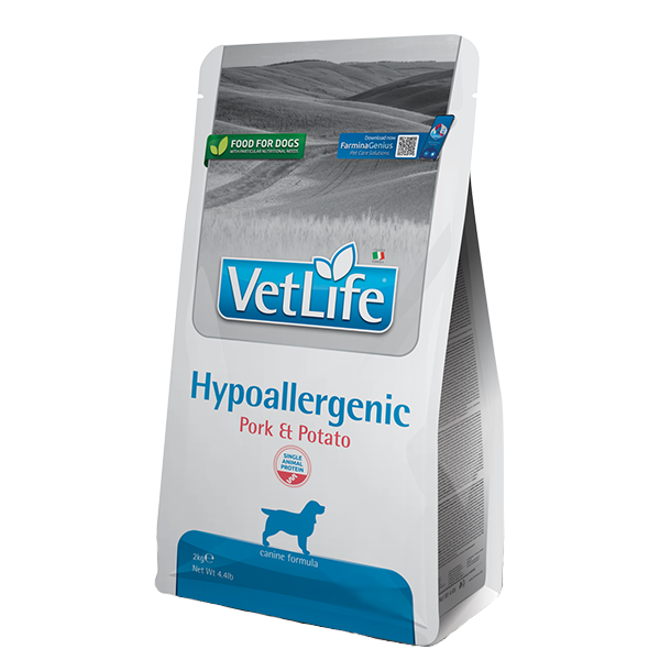 Farmina Vet Life Hypoallergenic Pork & Potato to pełnoporcjowa dietetyczna karma dla psów stosowana w celu obniżenia nietolerancji składników i substancji odżywczych; wspomagania funkcji skóry w przypadku dermatozy i wypadania sierści.