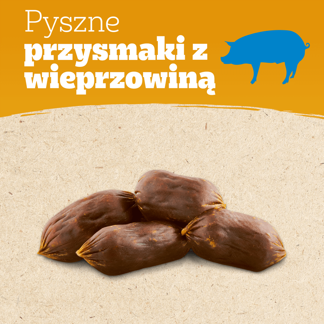 Karma uzupełniająca dla dorosłych psów o masie ciała powyżej 5kg. Nie jest przeznaczony dla szczeniąt i psów o masie ciała poniżej 5kg.