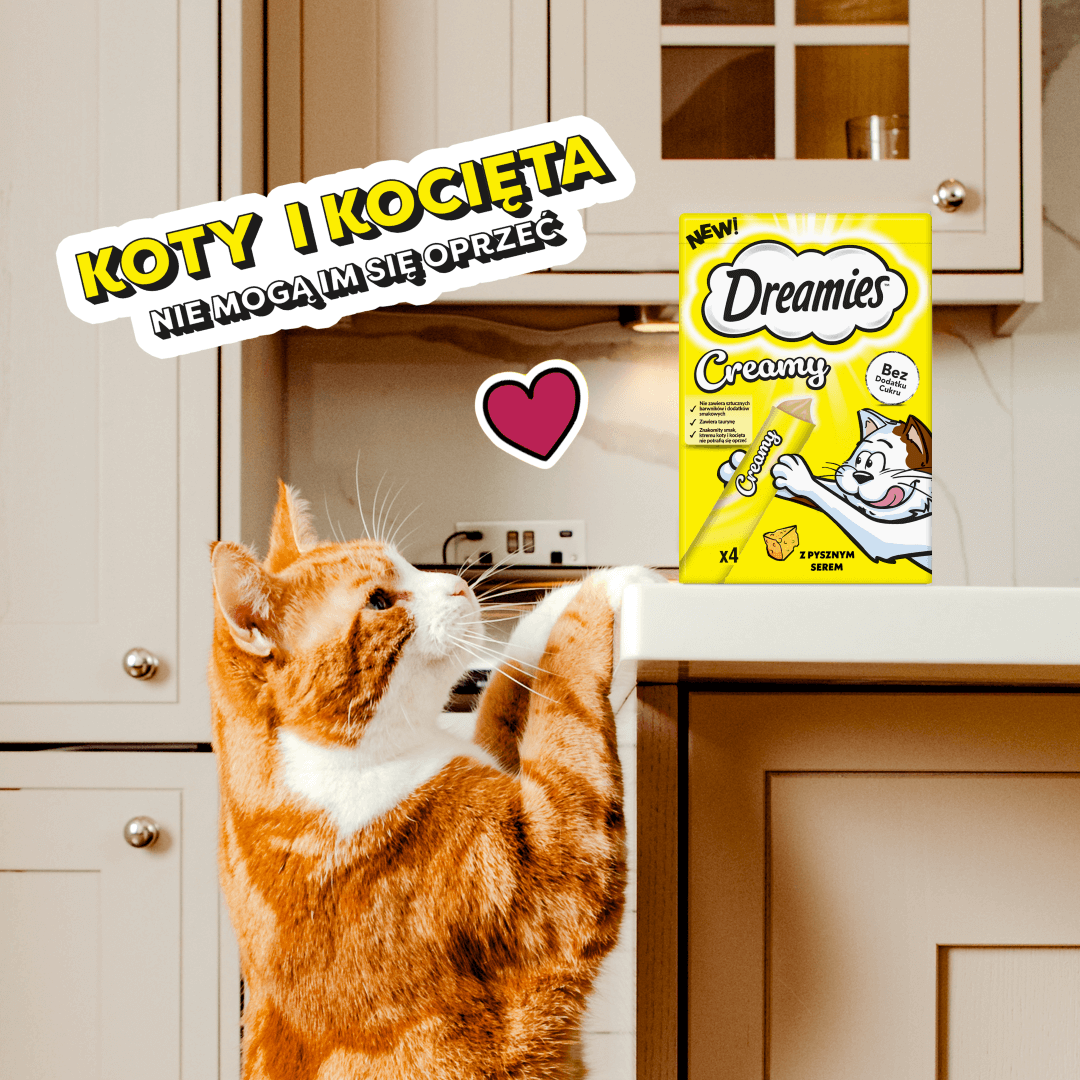 DREAMIES™ Creamy z pysznym serem to przysmak stworzony specjalnie z myślą o kotach. Idealny jako dodatek do karmy dla dorosłych kotów i kociąt powyżej 8 tygodnia życia.