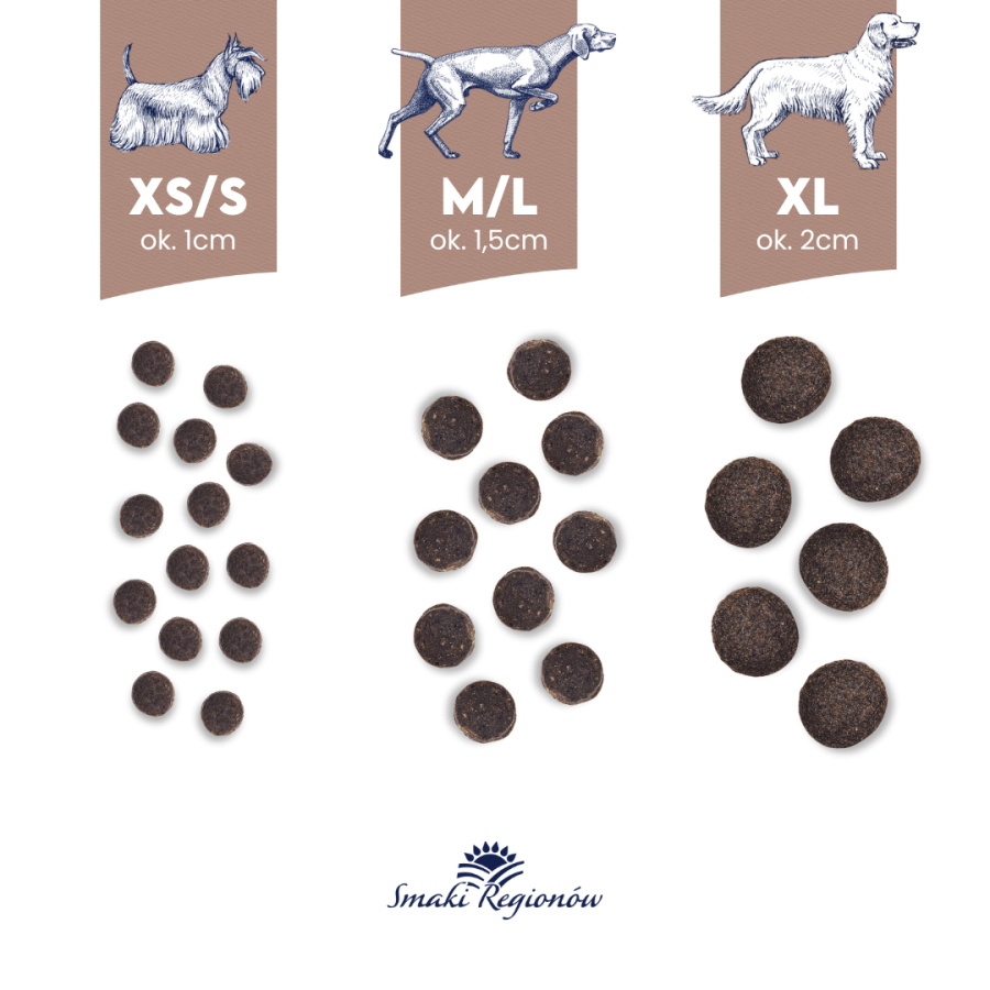 Skład: 49% dziczyzna, wieprzowina i tłuszcz wieprzowy (w tym: 20 % suszona dziczyzna, 19% suszona wieprzowina, 10% tłuszcz wieprzowy), 25% warzywa (batat, pietruszka (natka i korzeń)), 12,5% owoce (jabłko, malina, jagoda 2%, owoc dzikiej róży 2%), pulpa buraczana, drożdże piwne, skrobia ziemniaczana, minerały, zioła (ostropest plamisty, mięta, koper włoski), kompleks wspierający stawy (MSM (0,05%), siarczan glukozaminy (0,03%), siarczan chondroityny (0,015%)), kompleks omega 3 i 6, MOS (mannanooligosacharydy), FOS (fruktooligosacharydy).