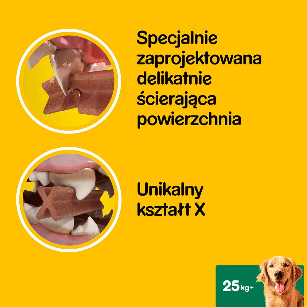 Pedigree DentaStix to smaczny przysmak dentystyczny o unikalnym kształcie X i specjalnej powierzchni ściernej dla psów średnich ras. Podawany codziennie ogranicza powstawanie kamienia nazębnego nawet do 80%, co zostało udowodnione badaniami naukowymi. Przysmaki Pedigree DentaStix posiadają strukturę o delikatnych właściwościach ścierających i aktywne składniki, które pomagają ograniczać gromadzenie się osadu i kamienia nazębnego. Dodatkowo, DentaStix zostały opracowane tak, aby Twój pupil długo je żuł, co zwiększa ich skuteczność. Przysmak Pedigree DentaStix ma niską zawartość tłuszczu, nie zawiera sztucznych barwników, aromatów ani dodatku cukru.