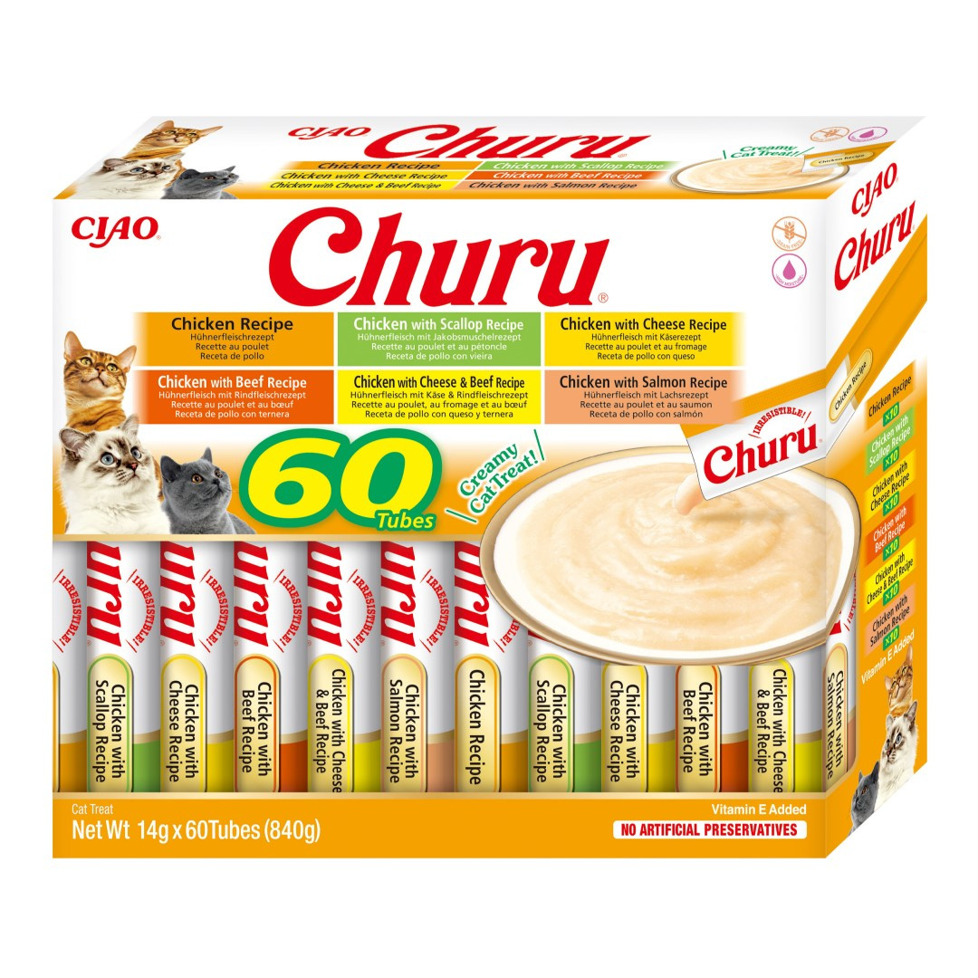 Churu są niskokaloryczne, nie zawierają zbóż i konserwantów, są produkowane z mięsa pochodzącego od kurczaków z wolnego wybiegu, naturalnie hodowanych na ściśle nadzorowanych fermach oraz z tuńczyka dalekomorskiego odławianego w sposób zrównoważony i certyfikowany i bezpieczny dla delfinów.