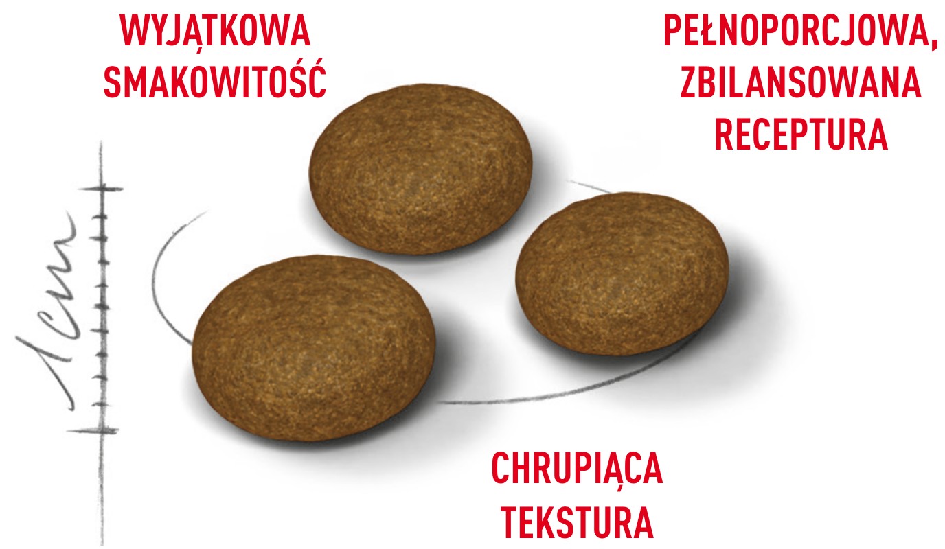 Wprowadzając nową karmę należy zachować okres przejściowy trwający 7- 10 dni. Należy ściśle przestrzegać zalecanych dziennych dawek karmy, znajdujących się na opakowaniu.