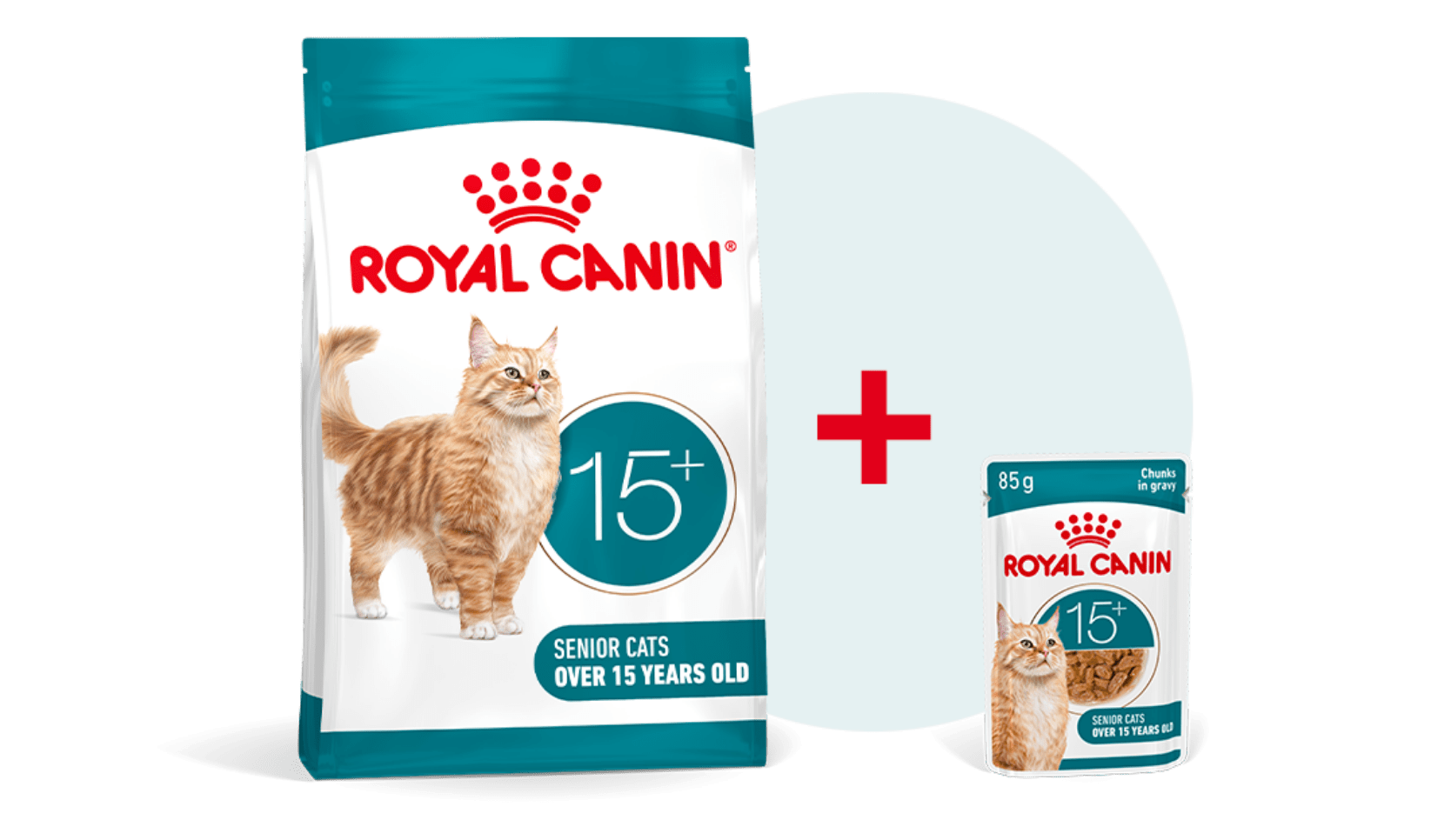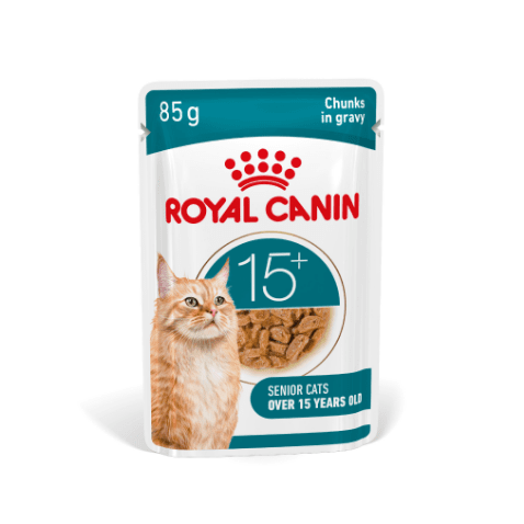 Karma ROYAL CANIN® AGEING 15+ dostępna jest zarówno w postaci suchej, jak i mokrej – kawałki w sosie. Karmienie mieszane pomaga pobudzić apetyt kota poprzez urozmaicenie konsystencji podawanego mu pokarmu i zaspokojenie jego indywidualnych preferencji.