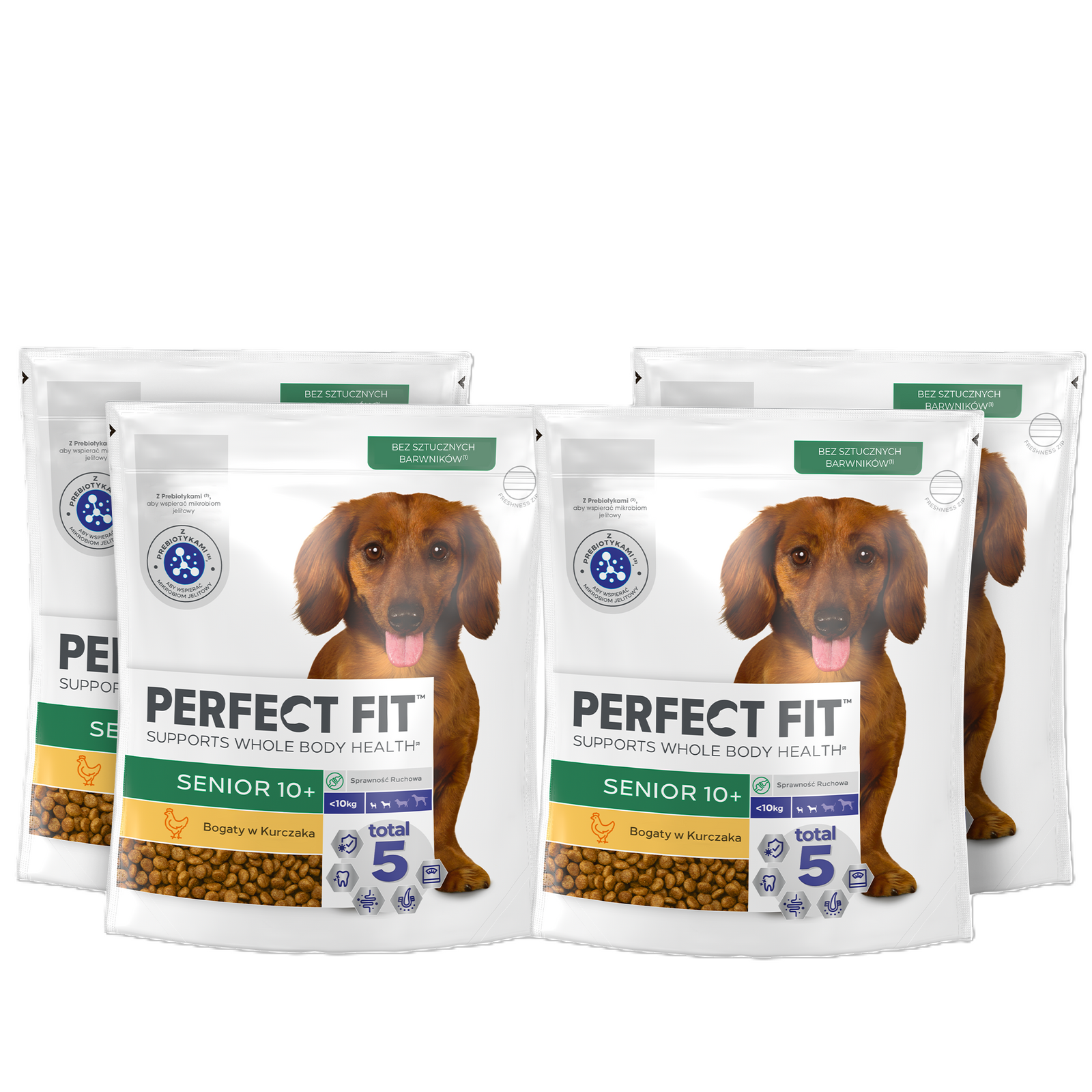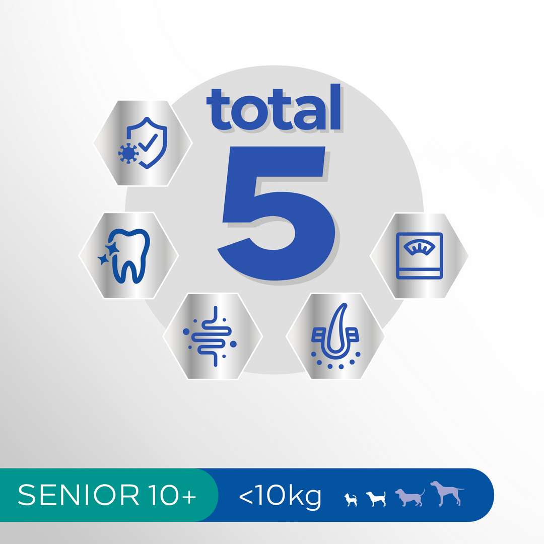 Pyszny pokarm Perfect Fit™ Senior 10+ bogaty w kurczaka zawiera wyjątkową formułę Total 5, która wspiera 5 najważniejszych obszarów zdrowia starszego pupila: wspomaga silny układ odpornościowy, zdrowie jamy ustnej, zdrowe trawienie, zdrową skórę i sierść oraz utrzymanie optymalnej kondycji i masy ciała.