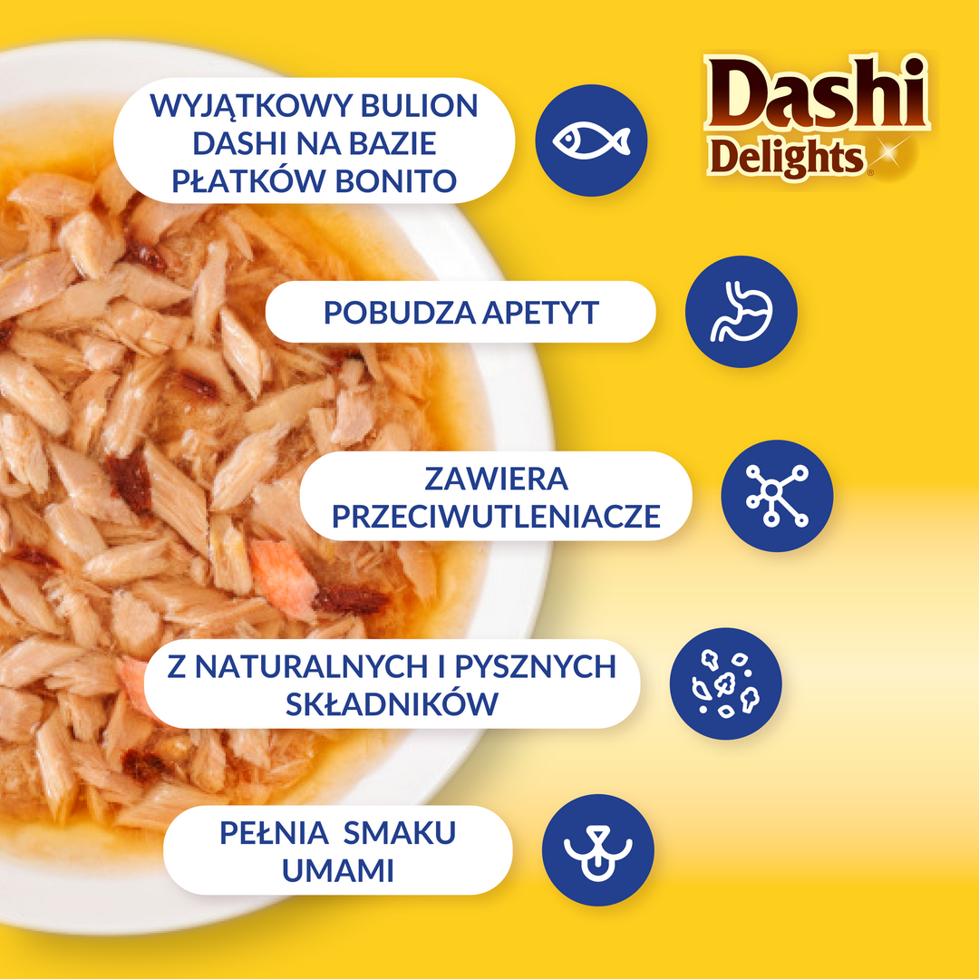 Dashi to tradycyjny japoński bulion rybny na bazie płatków z tuńczyka bonito, słynący z bogatego, wyrazistego smaku. To wyjątkowy przysmak o wysokiej wilgotności, bogaty w białko pochodzenia zwierzęcego, pozbawione zbóż, niepożądanych dodatków oraz sztucznych składników.
