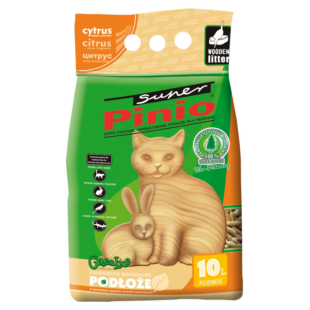 Super Benek Pinio Cytrus - podłoże o świeżym zapachu owoców cytrusowych. Żwirek Super Pinio to niezbrylające podłoże dla zwierząt domowych wykonane w 100% z naturalnego drewna drzew iglastych – mikro włókien drzew sosnowych i świerkowych, bez dodatków chemicznych. Posiadają bardzo wysoką chłonność oraz doskonale wiążą zapachy.
