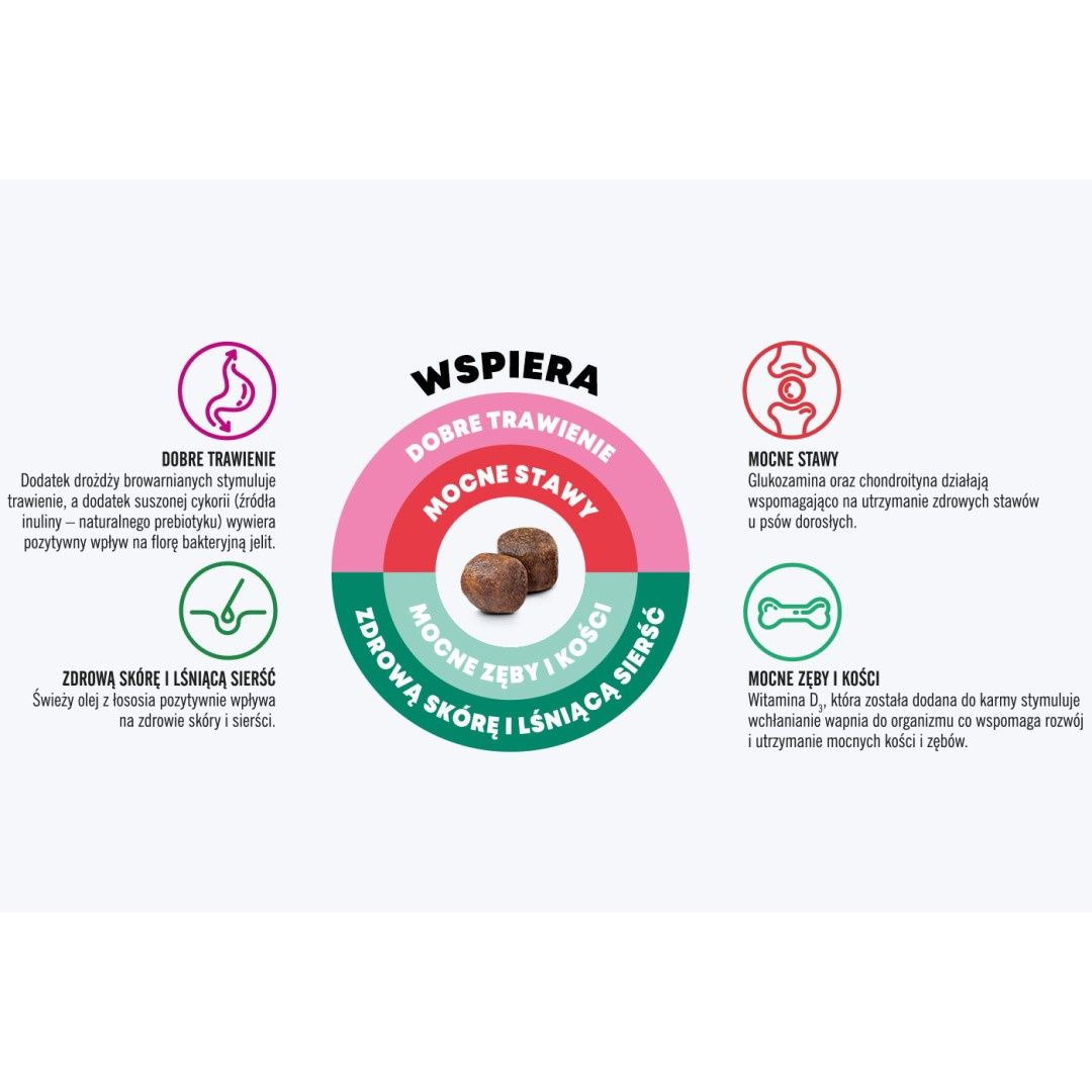 Karma została specjalnie opracowana z myślą o dorosłych psach małych ras, które wymagają odpowiednio skomponowanej diety dostosowanej do ich szybkiego metabolizmu i potrzeb żywieniowych. Dzięki bezglutenowej formule karma stanowi doskonałe rozwiązanie żywieniowe dla małych psów z nietolerancjami pokarmowymi oraz tych ze skłonnościami do problemów trawiennych. Brak składników drobiowych sprawia, że karma nada się dla czworonogów uczulonych na drób. Mniejsze granulki zostały dostosowane do rozmiaru pyska i zębów psów małych ras, co wspomaga prawidłowe żucie i trawienie u tych delikatnych czworonogów.