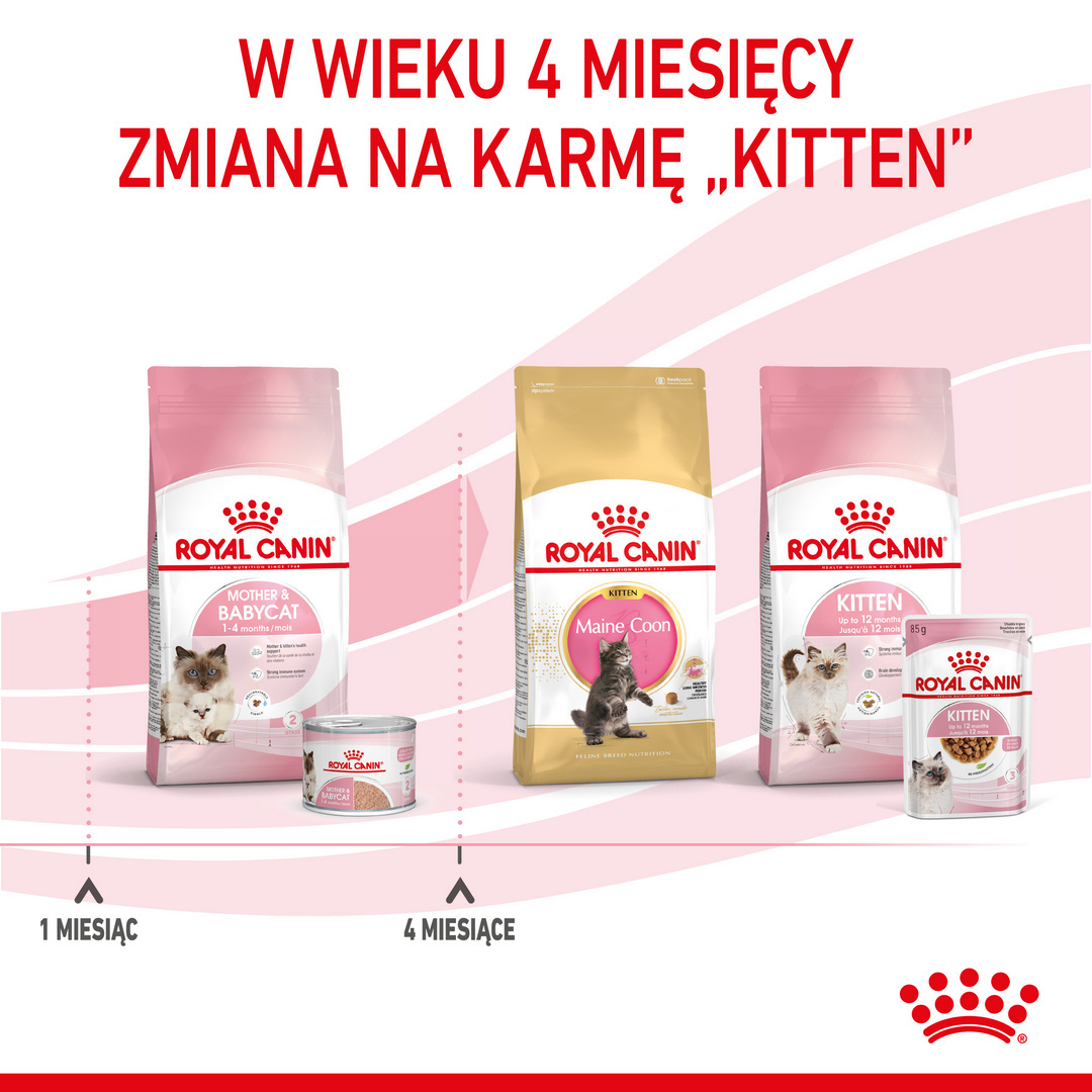 Czy wiesz, że potrzeby żywieniowe kociąt zmieniają się w okresie wzrostu? Po ukończeniu pierwszych 4 miesięcy życia kocięta potrzebują diety, która jest odpowiednio dostosowana do ich potrzeb pokarmowych w kolejnym etapie wzrostu. W tym czasie należy przejść na wybrane produkty ROYAL CANIN® Kitten, które są dostępne w formie karm suchych lub mokrych (pasztet, kawałki w sosie lub galaretce).