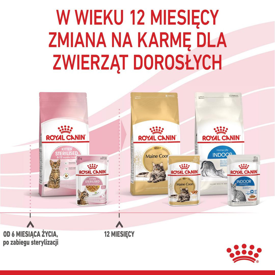 Mając na uwadze preferencje żywieniowe kociąt, karma mokra ROYAL CANIN® Kitten Sterilised jest dostępna także w formie kawałków w sosie oraz formie suchej, w postaci smakowitych krokietów. W przypadku żywienia karmą mokrą i suchą należy zapoznać się z tabelą dawkowania, aby dobrać odpowiednią porcję poszczególnych karm.