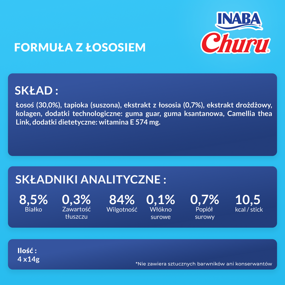 Przekąski Churu® są nie tylko smaczne i zdrowe, ale również niskokaloryczne. Idealnie sprawdzą się przy podawaniu tabletek. Są doskonałą nagrodą podczas szkolenia. Mogą być stosowane również jako dodatek do mokrych i suchych karm.