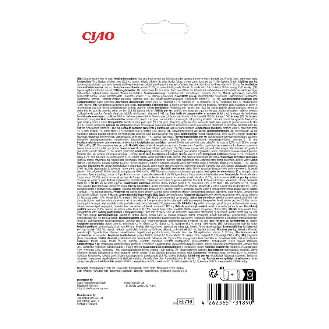 Skład: kurczak, tuńczyk (22,8%), maniok (suszony), tłuszcz z kurczaka, suszone wiórki ryby bonito, pasta z krewetek, ekstrakt z tuńczyka (1,1%), tapioka (suszona).