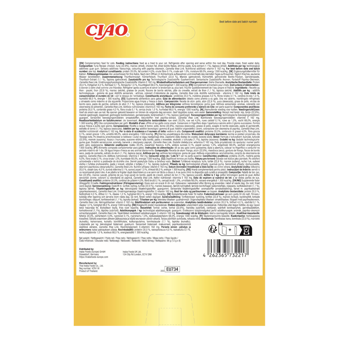 Skład: kurczak, tuńczyk (22,8%), maniok (suszony), tłuszcz z kurczaka, suszone wiórki ryby bonito, pasta z krewetek, ekstrakt z tuńczyka (1,1%), tapioka (suszona).