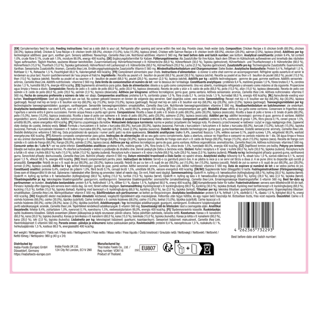 Chicken & Tuna Recipe: Bulion o smaku kurczaka (68,0%), kurczak (15,0%), tuńczyk (15,0%), tapioka (suszona).
