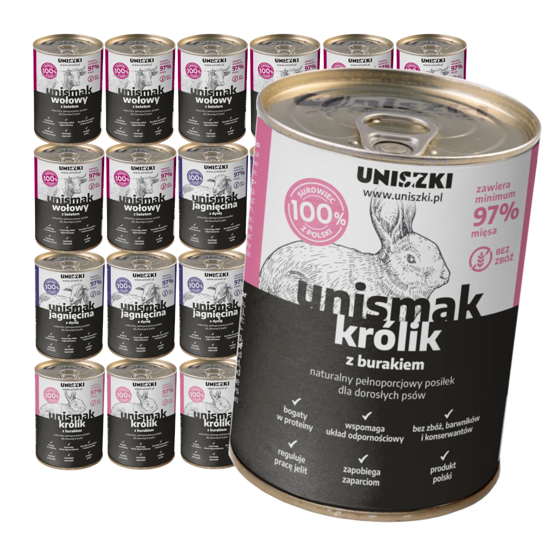 Uniszki Unismak 24x400g Bezzbożowa Mokra Karma dla Psa Mix Smaków Jagnięcina Królik Wołowina