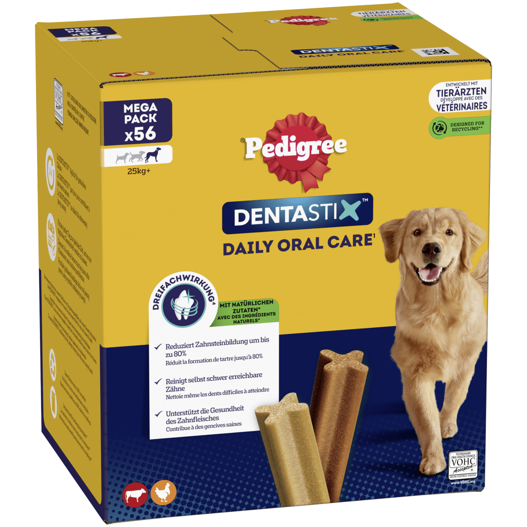 PEDIGREE® DentaStix Codzienna Pielęgnacja to pokarm uzupełniający dla psów powyżej 4. miesiąca życia. Przeznaczony jest dla psów dużych o wadze powyżej 25kg. Ten przysmak działa pozytywnie na zęby i dziąsła pupila - oczyszcza je i redukuje tworzenie się kamienia nazębnego. Z PEDIGREE® DentaStix skutecznie troszczysz się o zdrowie i witalność swojego psa.