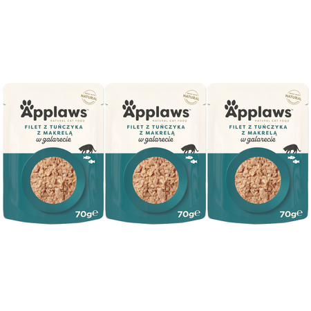 Applaws Tuna Fillet with Mackerel in Jelly 70g to 100% naturalna, uzupełniająca mokra karma dla dorosłych kotów, przyrządzona z żelującym wywarem rybnym i kawałkami premium tuńczyka oraz makreli.y