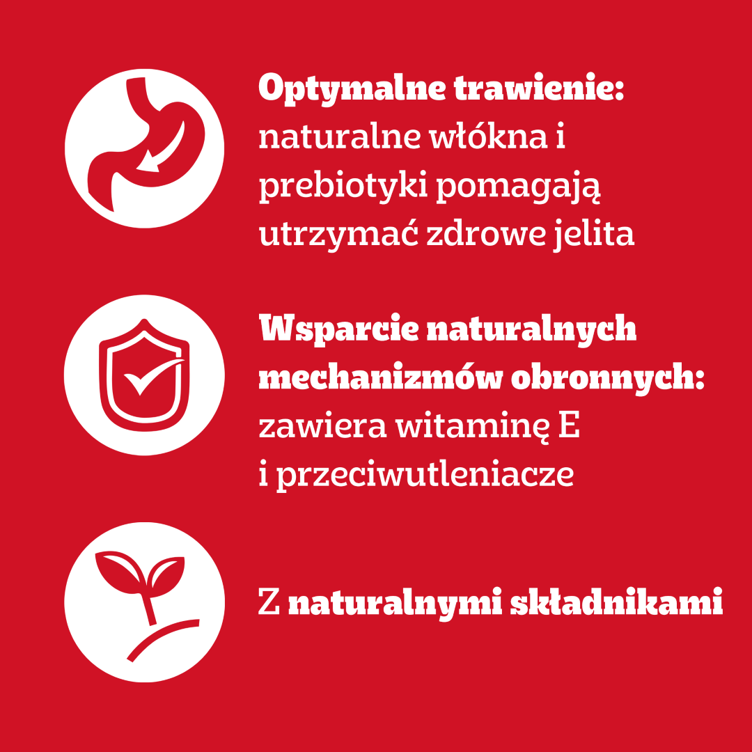 - OPTYMALNE TRAWIENIE: naturalne włókna i prebiotyki pomagają utrzymać zdrowe jelita.