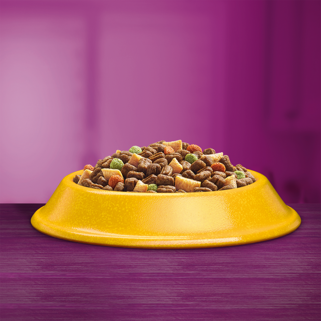 Skład: zboża (w tym pszenica 4%), mięso i produkty pochodzenia zwierzęcego (w tym 4% kurczaka w brązowych granulkach*), produkty pochodzenia roślinnego (w tym cykoria 2% i celuloza 2%), oleje i tłuszcze, roślinne ekstrakty białkowe, substancje mineralne, cukry, warzywa (w tym 0,5% suszonej marchewki co odpowiada 4% marchewki w pomarańczowych granulkach i 1% suszonego groszku co odpowiada 4% groszku w zielonych granulkach*), drożdże.