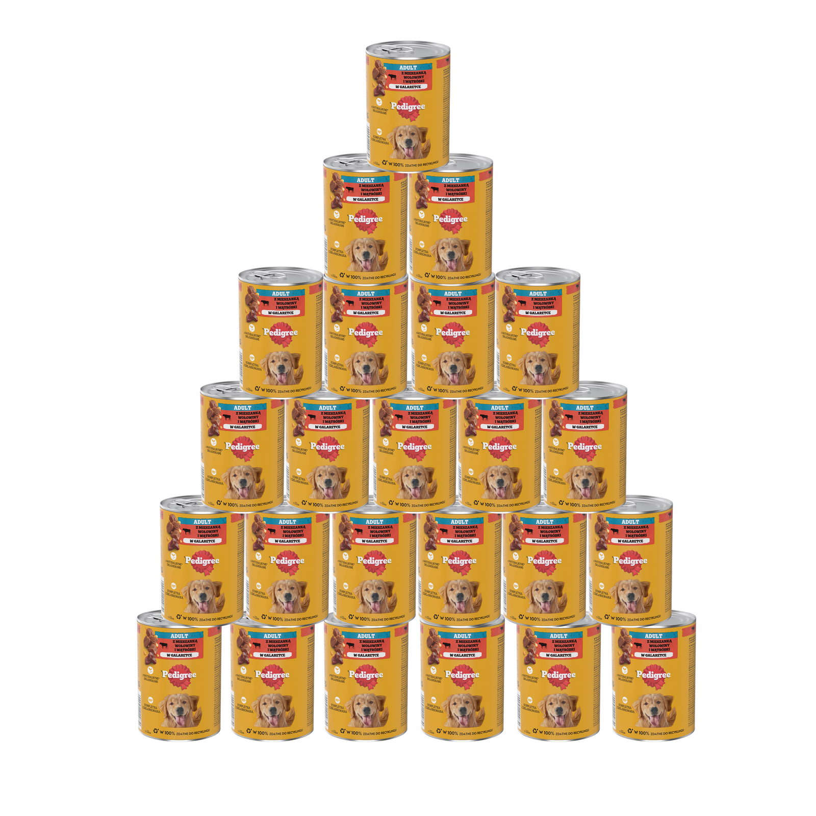 Mokra karma PEDIGREE® Adult z mieszanką wołowiny i wątróbki w aromatycznej galaretce to pełnoporcjowe pożywienie przeznaczone dla dorosłych psów.