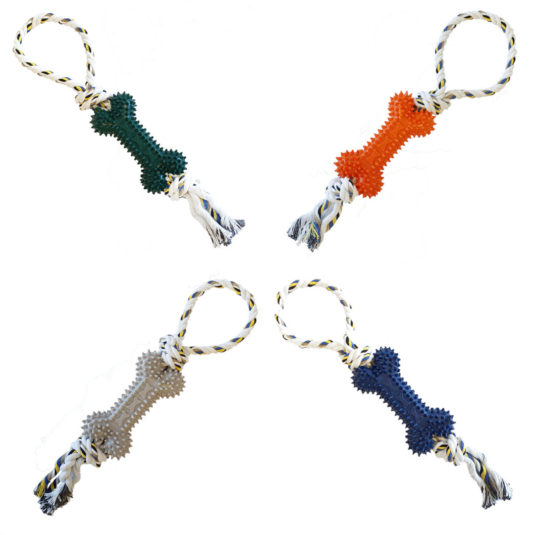 Sznur jest wykonany z wielokolorowej bawełny oraz posiada na końcach pętelkę i piłkę. Ta zabawka zaspokaja również potrzebę żucia i gryzienia oraz pomaga rozładować stres. Doskonały do umilenia psiakowi czasu spędzanego w domu w oczekiwaniu na Twój powrót.